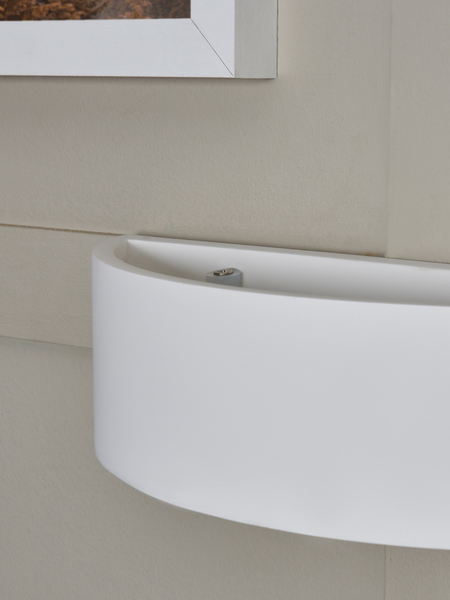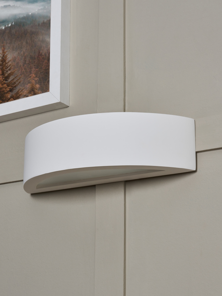 The Baza Up and Down Wall Light is a minimalist lighting fixture with a slim, curved design that illuminates both upward and downward, creating a beautiful glow. It features a white plaster finish that can be painted to match your home’s color scheme, offering a seamless look for modern or minimalist interiors.