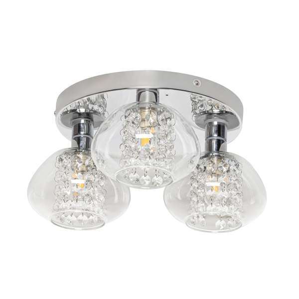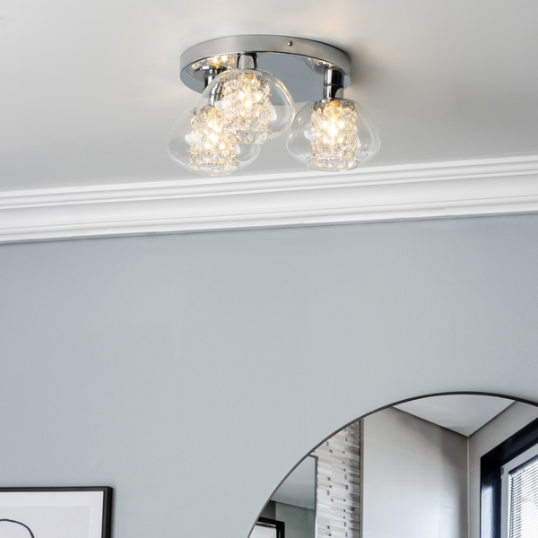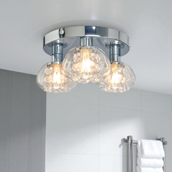 Exhibit an opulent appearance in your bathroom with the Vancouver 3 Light Flush Ceiling Light, designed with a polished chrome finish that offers a contemporary look. The three transparent glass diffusers gently diffuse the light and crystal-like droplets, producing a cozy and inviting illumination with a touch of shimmer. Boasting an IP44 rating, it is perfectly suited for secure installation in bathrooms.