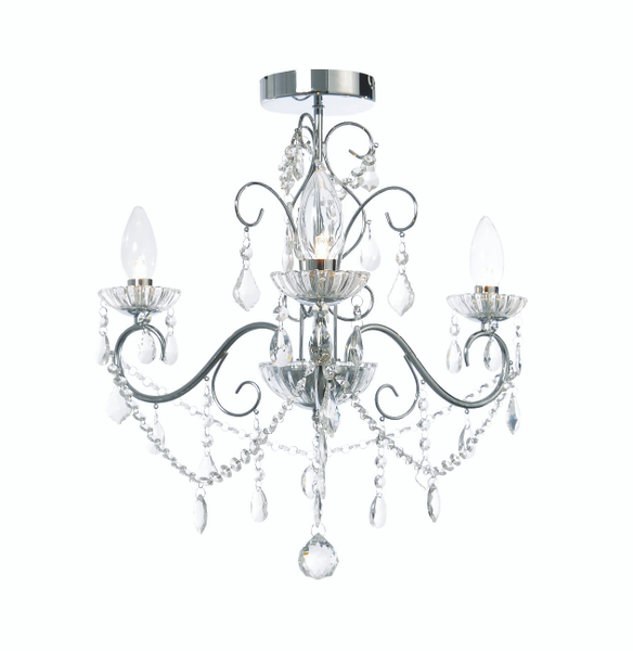 The Vela 3-Light Bathroom Chandelier adds an opulent touch to your bathroom with its elegant design. Featuring curved polished chrome arms adorned with crystal beads and droplets, it creates a subtle shimmering effect that enhances the room’s ambiance. The chandelier is IP44 rated, making it safe for use in bathroom zone 2. Its sophisticated design is perfect for homes looking to combine modern style with elegance. Hang it above a freestanding bathtub for a dramatic focal point, complementing any décor with its polished chrome finish.