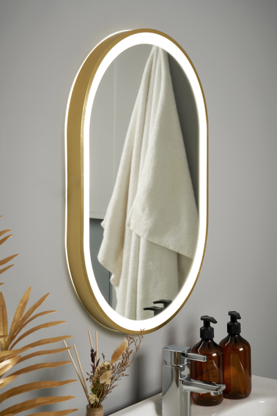 Cian CCT LED Oval Framed Mirror in satin brass with a touch on /off switch. The built in demist pad keeps the surface clear of condensation. The mirror has 3 selectable colour temperatures.