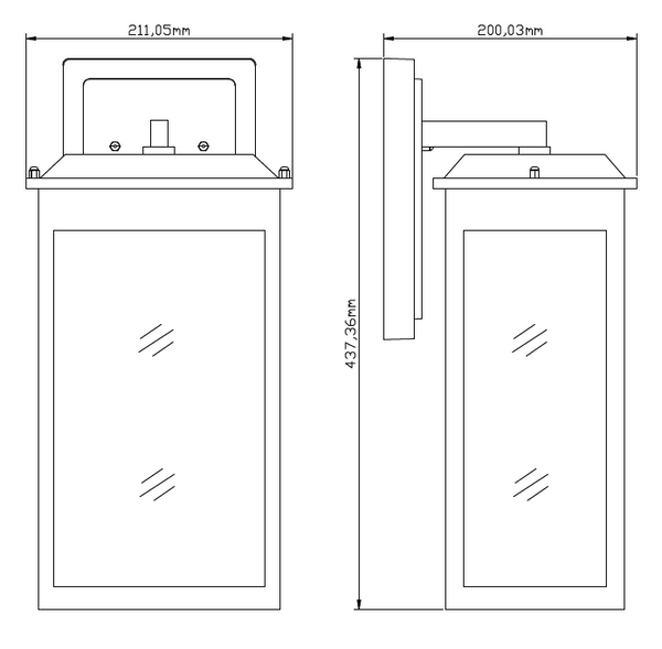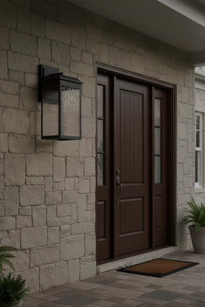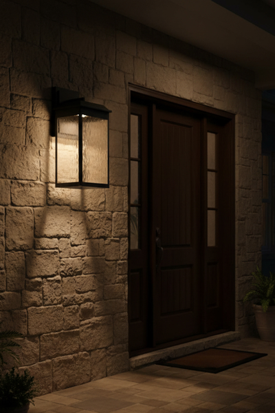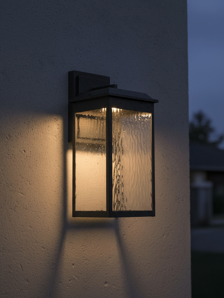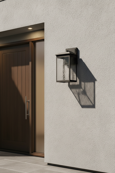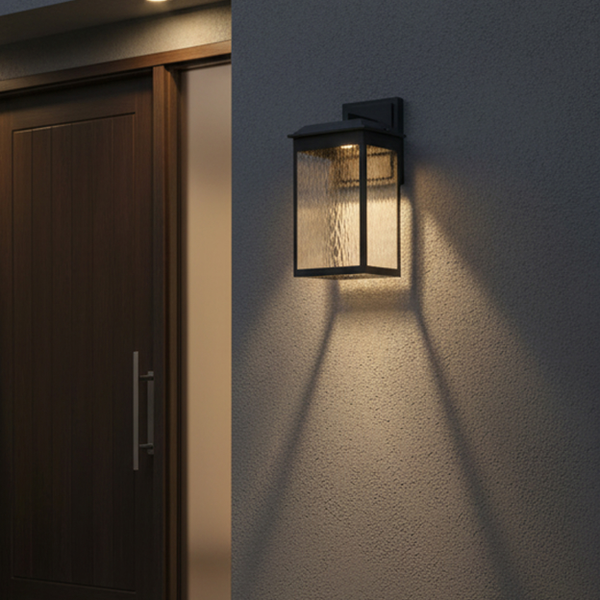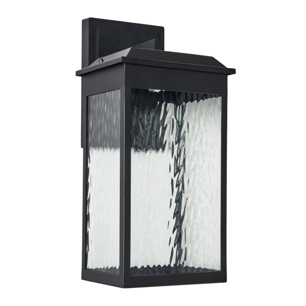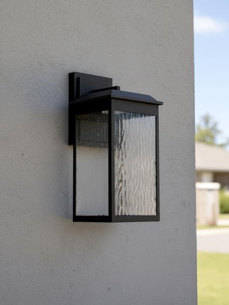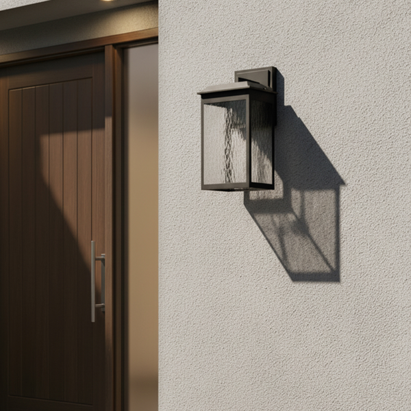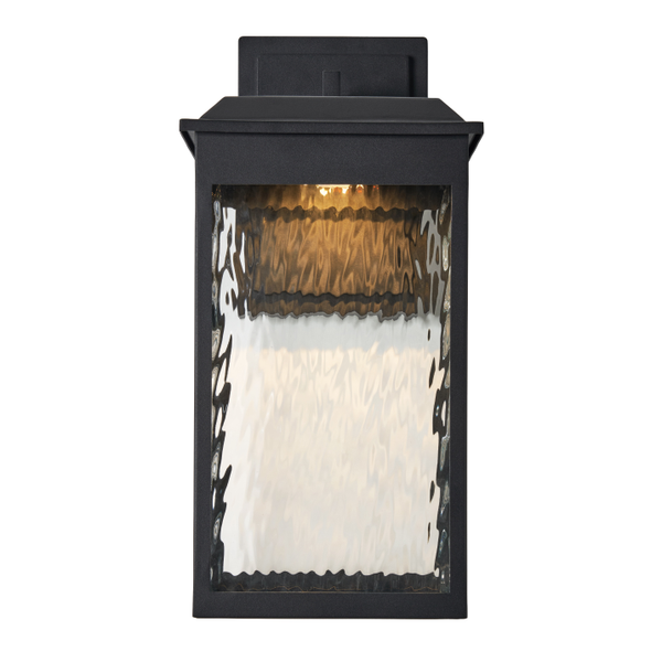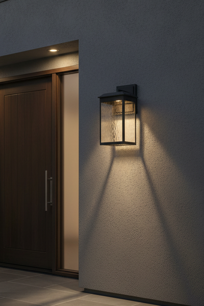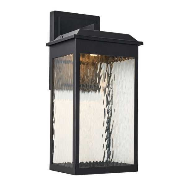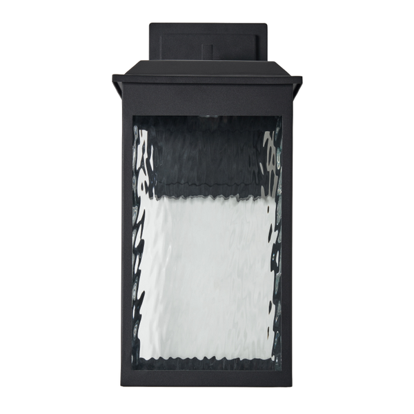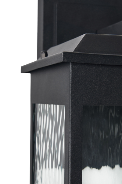 The large Ainsel outdoor wall lantern combines clean architectural lines with warm, welcoming illumination, making it an ideal choice for modern and transitional exteriors. The fixture features a sleek, rectangular frame finished in matte black, delivering a bold yet understated presence against exterior walls. Textured, seeded glass panels softly diffuse the light while adding visual interest and depth. The subtle surface pattern enhances the glow, creating a warm and inviting ambiance while minimizing glare. A flat, slightly extended top cap adds a contemporary touch and provides additional protection from the elements.