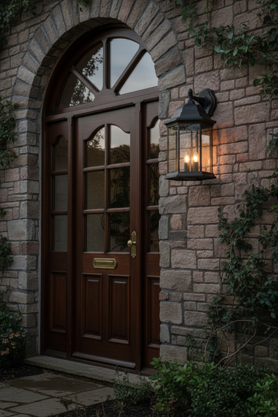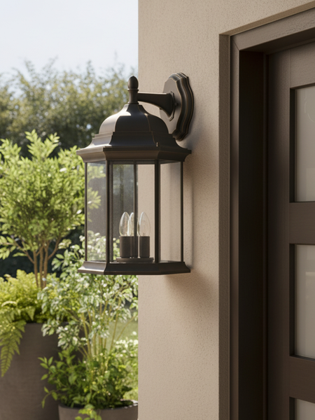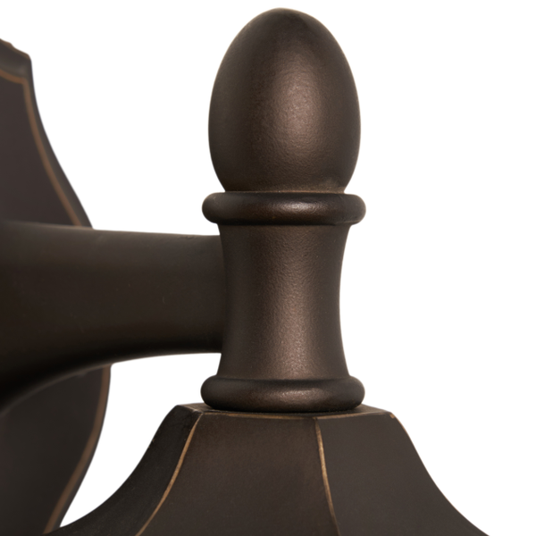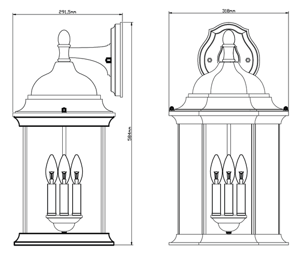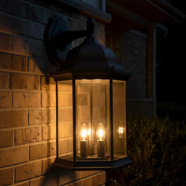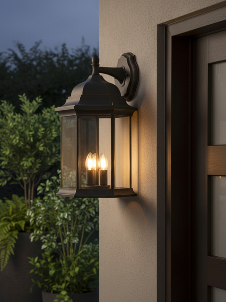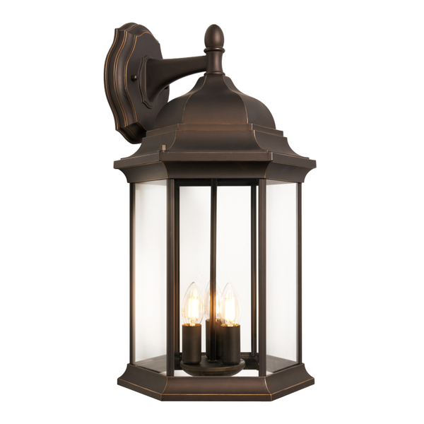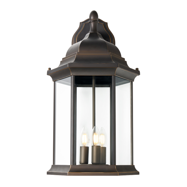 The Ardley extra large outdoor wall lantern features a rich antique bronze finish that brings warmth and depth to its classic silhouette. Designed with a stately, domed top and decorative finial, the fixture is mounted on a sculpted backplate with subtle contour detailing, adding architectural elegance to any exterior space. Clear beveled glass panels surround the interior, showcasing three E14 candle-style bulbs .