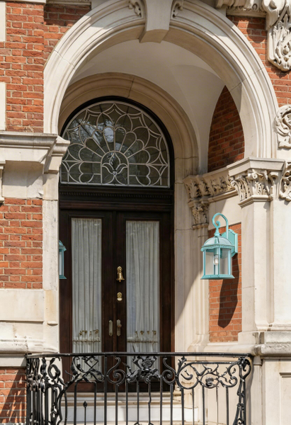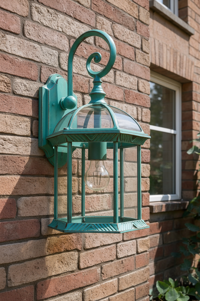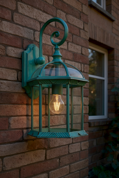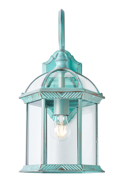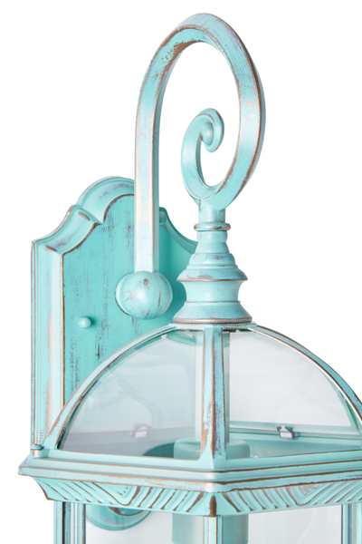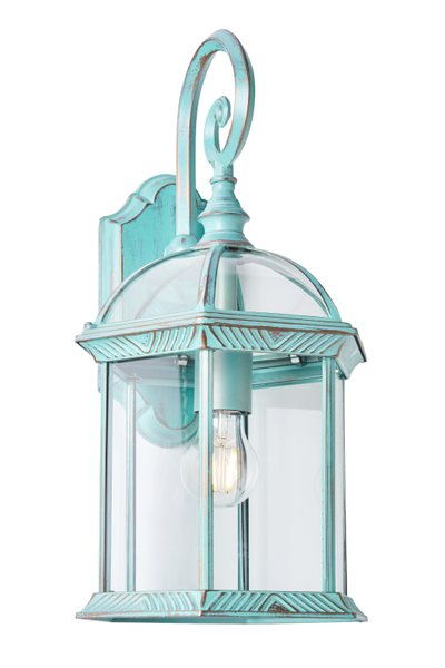 Bring Old World elegance to your outdoor space with the Corbin large outdoor lantern, designed with a stunning weathered verdi gris patina. This ornate fixture is defined by its graceful domed roof and intricate diagonal cross-hatch engraving along the metal trim. The clear, glass panes offer maximum visibility and a clean, polished look that highlights the internal illumination, finished with a classic shepherd’s hook scroll.